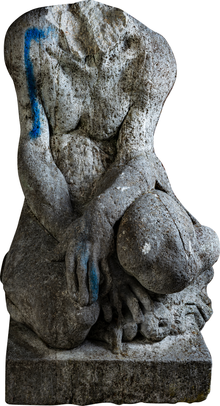 Was löst der Zustand dieser Skulptur bei Ihnen aus? 1980 wurde in Berlin-Zehlendorf das ehemalige Atelier und Wohnhaus Hasemanns abgerissen. Durch das Engagement einflussreicher Nachbarn wurden fünf Jahre später zwei seiner Werke auf dem Grünstreifen diesem Grundstück gegenüber aufgestellt. Die hier gezeigte Skulptur sowie die eines stehenden Fauns sollten der Erinnerung an den Künstler dienen.